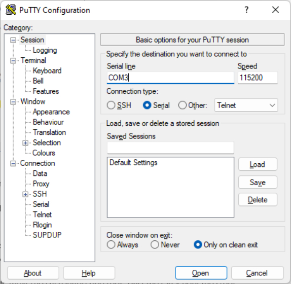 - A continuación, vuelva a su aplicación de terminal y especifique el puerto COM en el campo correspondiente. En el campo "velocidad", especifique 115200.